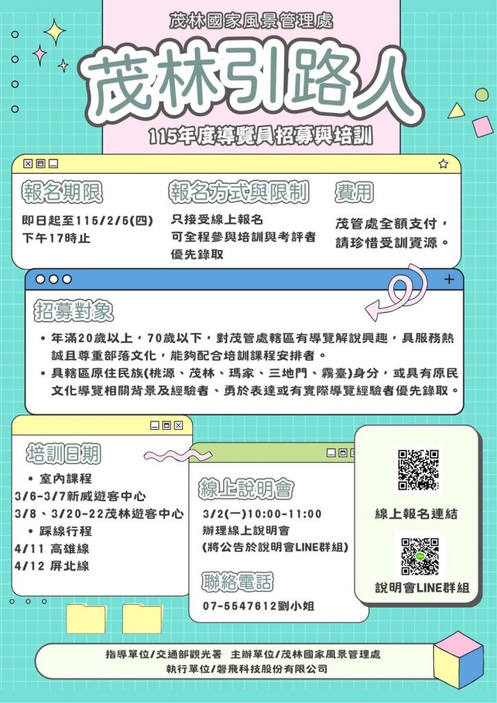茂林國家風景區管理處-115年度導覽解說志工招募 By assistIn 最新消息Posted 2026 年 1 月 16 日 一、 為提升本轄區及接待服務品質,自即日起辦理115年度導覽解說志工招募,報名期限至115年2月5日止,僅接受線上報名。二、檢送旨揭招募簡章及海報各1份,並請逕至本處官網公告區下載或逕行填報報名表:https://reurl.cc/3bQMj0,招募人數有限,額滿為止,相關問題請洽本處(07)687-1234分機246,邱小姐。 志工招募簡章下載